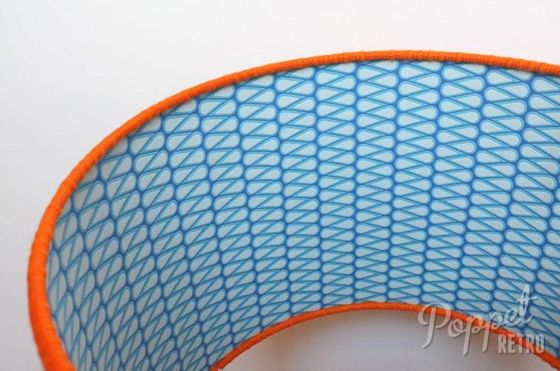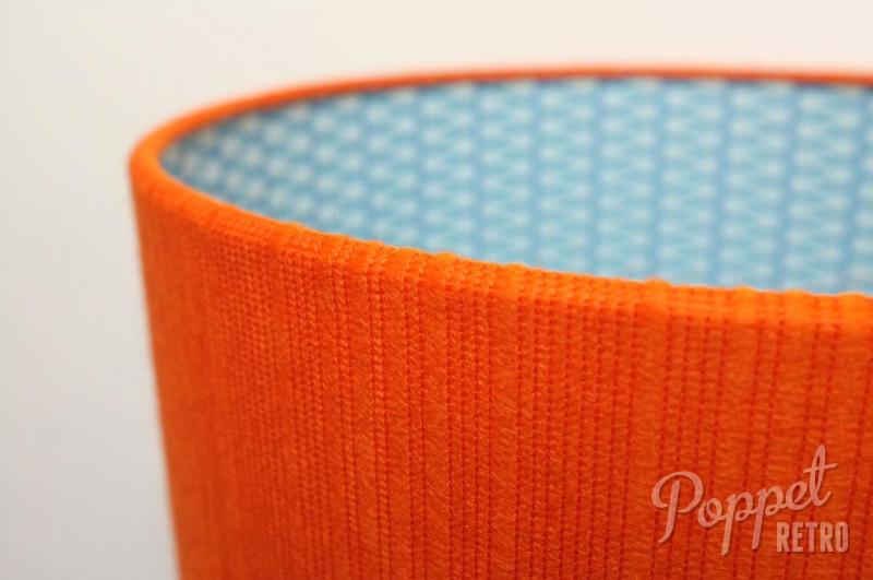 This lampshade is covered with superb midcentury orange fabric and lined with really lovely blue geometric new wallpaper. Also available in 40cm diameter.