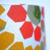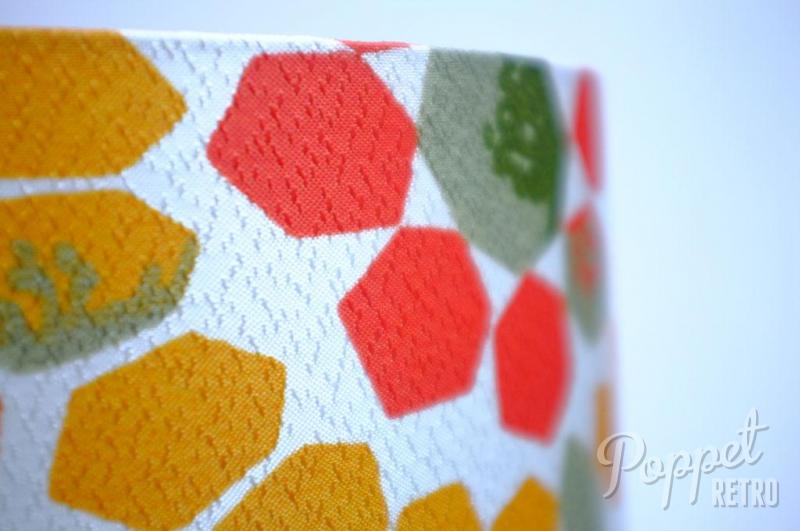 This lampshade is covered in original mid-century 'fibreglass' fabric which has a lovely shine to it and has a great bright, geometric design which lets out loads of light!