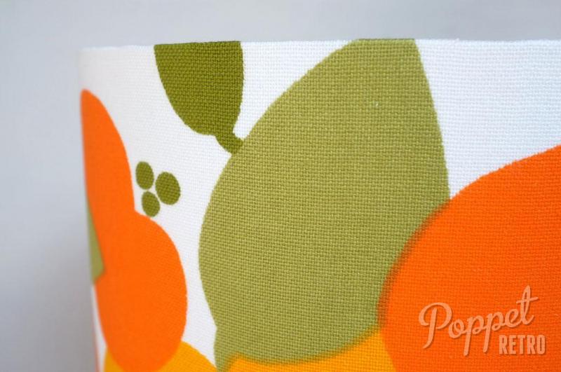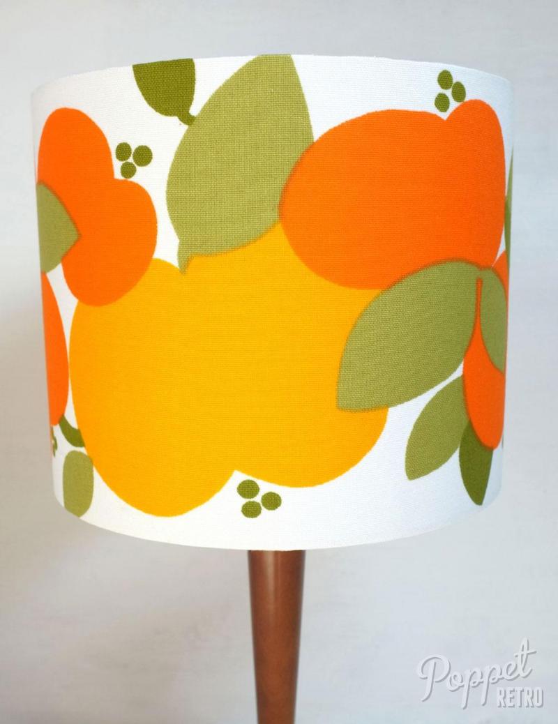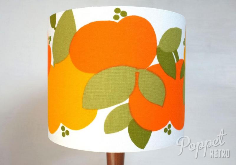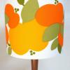This lampshade is made with bright and lovely white, orange, yellow and green fruity fabric from the 70s. A bit taller than our usual 30cm drum shades.