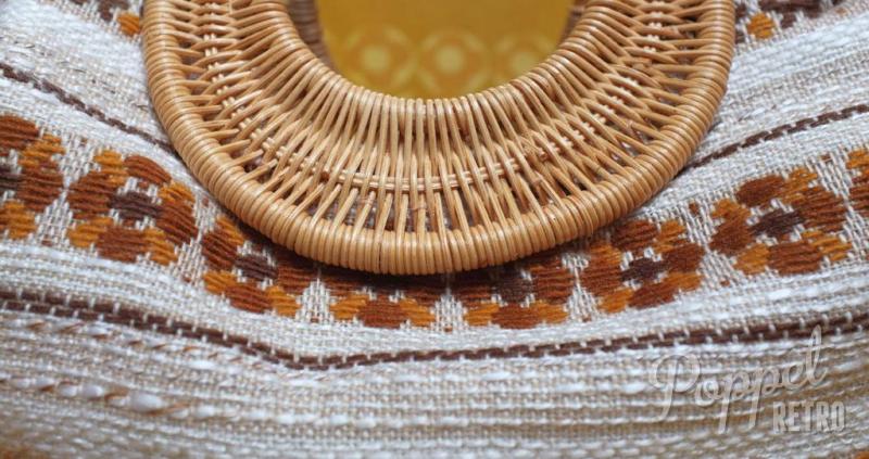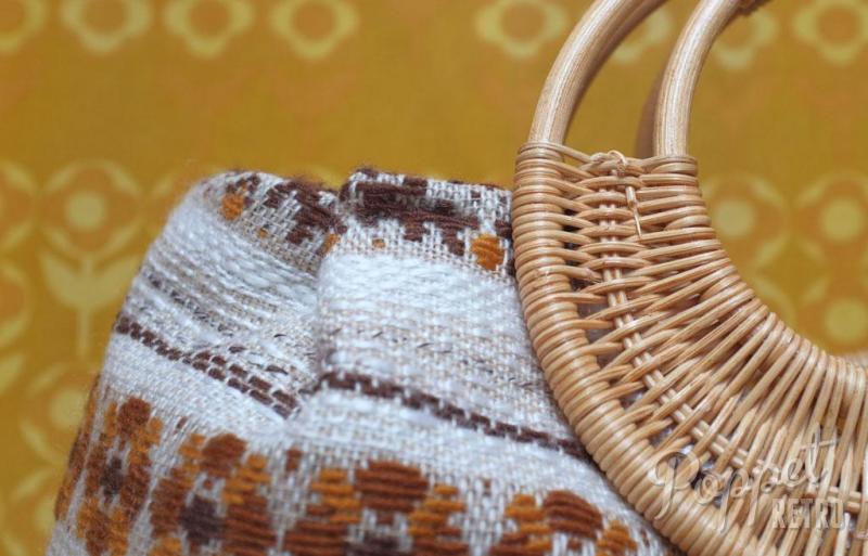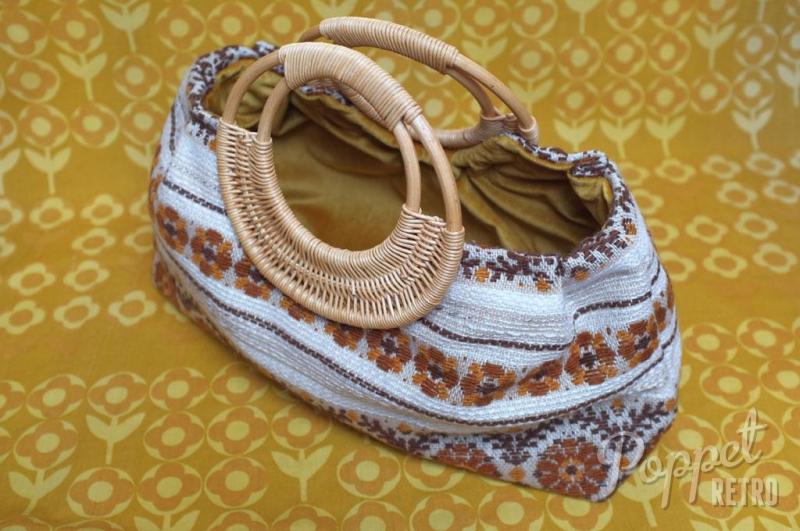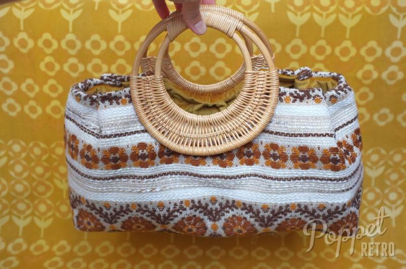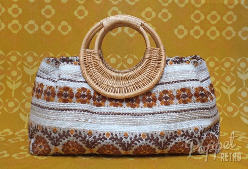 This amazing handbag is retro looking but actually a one off and handmade new. Gorgeous, woven, 70s fabric with new retro bamboo handle and gold velvet lining.