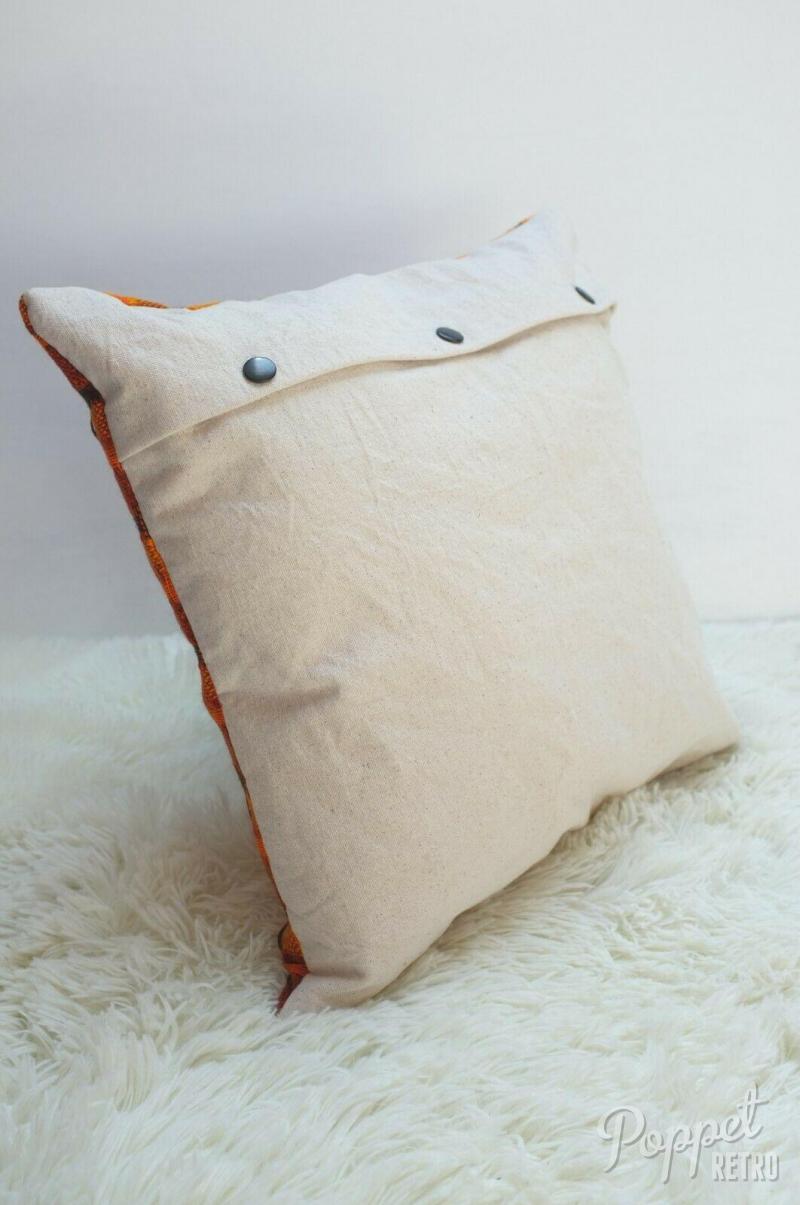 Cushion coevr is 16" x 16" in vintage, orange and brown, woven, tartan fabric.